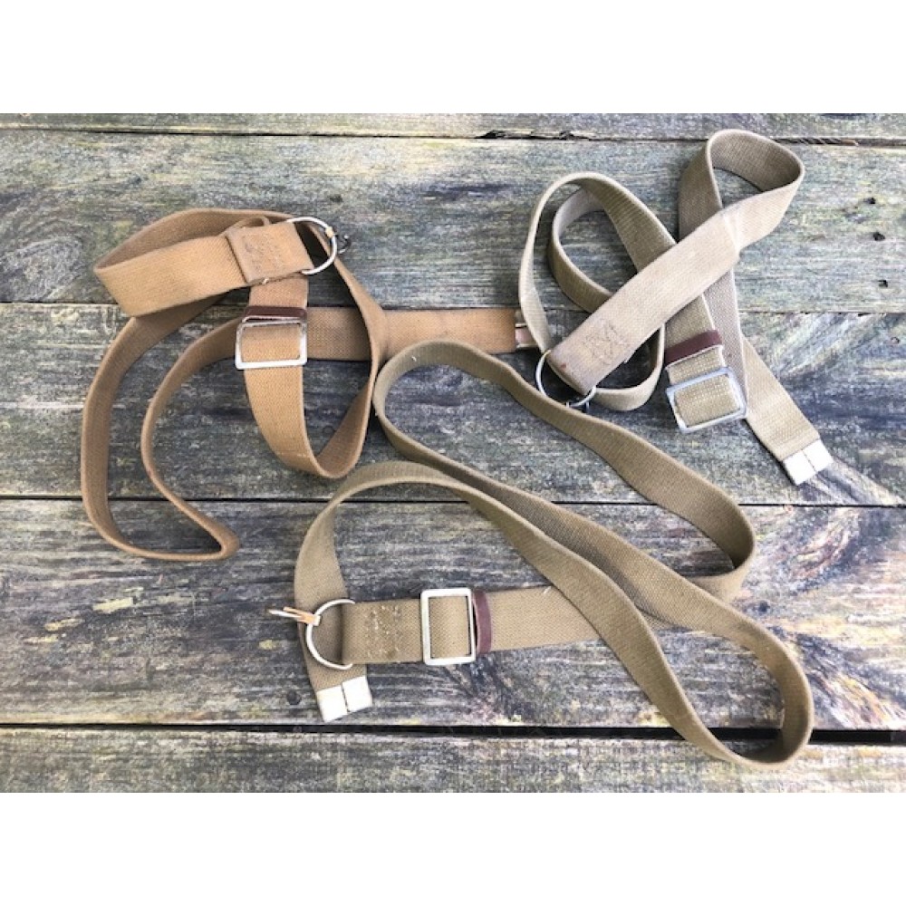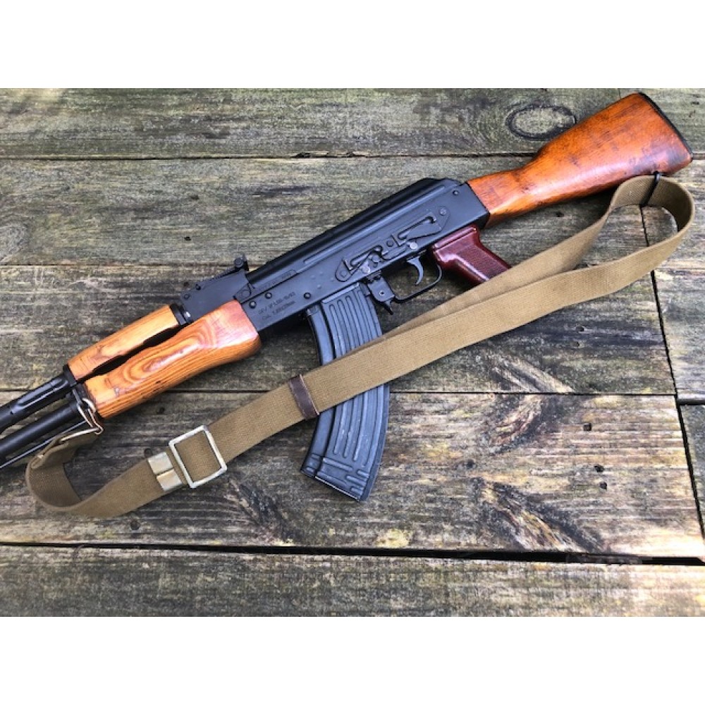 Russian AK Web Sling. These have no markings that we found but based on the material and construction we believe these are Russian. Approx 59" x 1 3/8". These slings are in good to very good surplus condition. Colors vary from sling to sling. Since this does not look like your average AK sling, we attached it to one of our company owned rifles for comparison. Please note that the slings we currently have in inventory do not have the leather loop keeper.