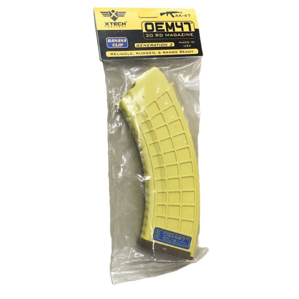 The XTech Tactical OEM47 Gen2 is a 30-round 7.62x39mm (AK-47) compatible magazine in Banana color. It features an advanced impact resistant polymer construction and a a quick release base plate for easy cleaning. The OEM47 includes a Spring anti-bind mechanism with a Stainless Steel Spring. New in packaging! Made in USA. MPN: XT2011141